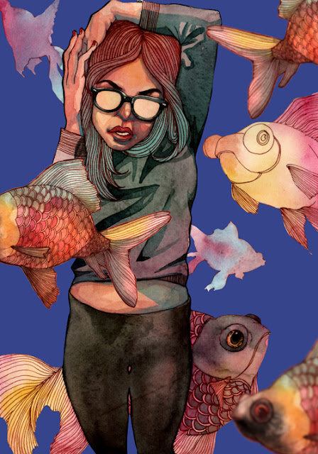 I lined my blue graphite sketch with a brown micron pen, then after that, erased the blue and started painting. The first wash I start out with usually has 3-4 different colors and I do this very lightly. Then I use a layering technique to build up my values until I feel it looks finished. After all the painting is done, I scan my work at 400dpi and add a flat colored background on Photoshop CS5.